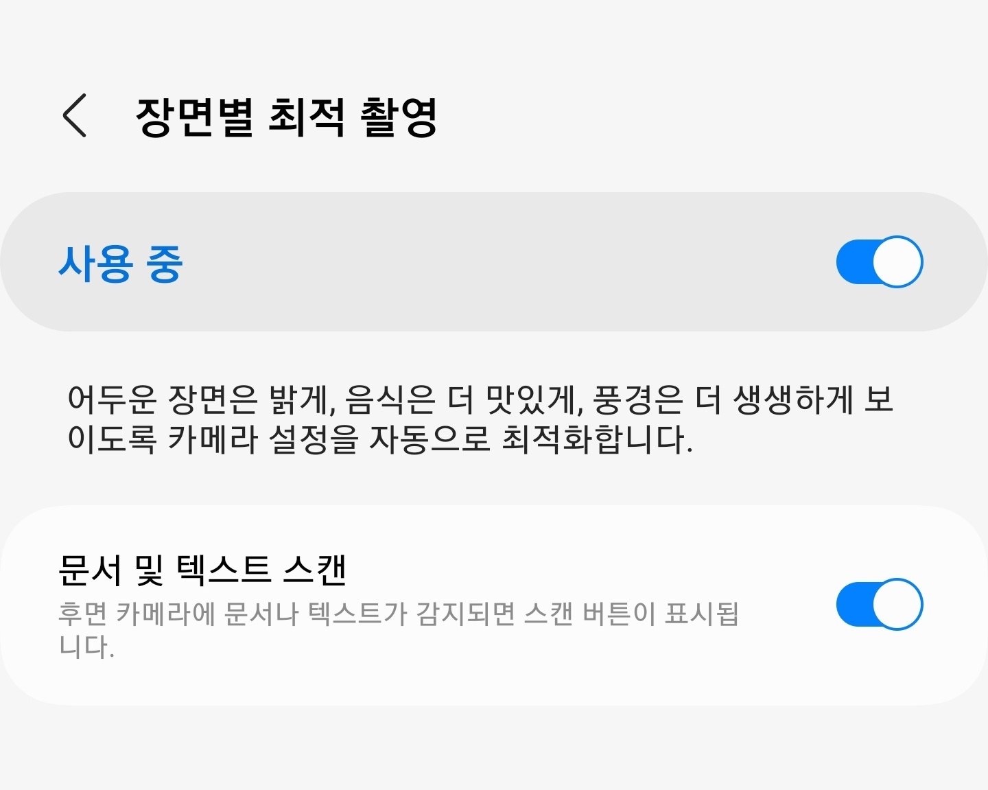 인텔리전트 기능에는 장면별 최적 촬영, 촬영 구도 추천, QR 코드 스캔 설정이 있습니다. 장면별 최적 촬영은 활성화 시 어두운 장면은 밝게, 음식은 더 맛있게, 풍경은 더 생생하게 보이도록 카메라 설정을 자동으로 최적화합니다. 장면별 최적 촬영을 활성화 시 추가로 '문서 및 텍스트 스캔'을 활성화시킬 수 있습니다. 활성화 시 후면 카메라에 문서나 텍스트가 감지되면 스캔 버튼이 표시됩니다. 촬영 구도 추천은 활성화 시 추천 가이드에 맞춰 가장 좋은 구도로 사진을 찍을 수 있습니다. QR 코드 스캔은 활성화 시 QR 코드를 스캔하면 각종 정보를 제공받을 수 있습니다.