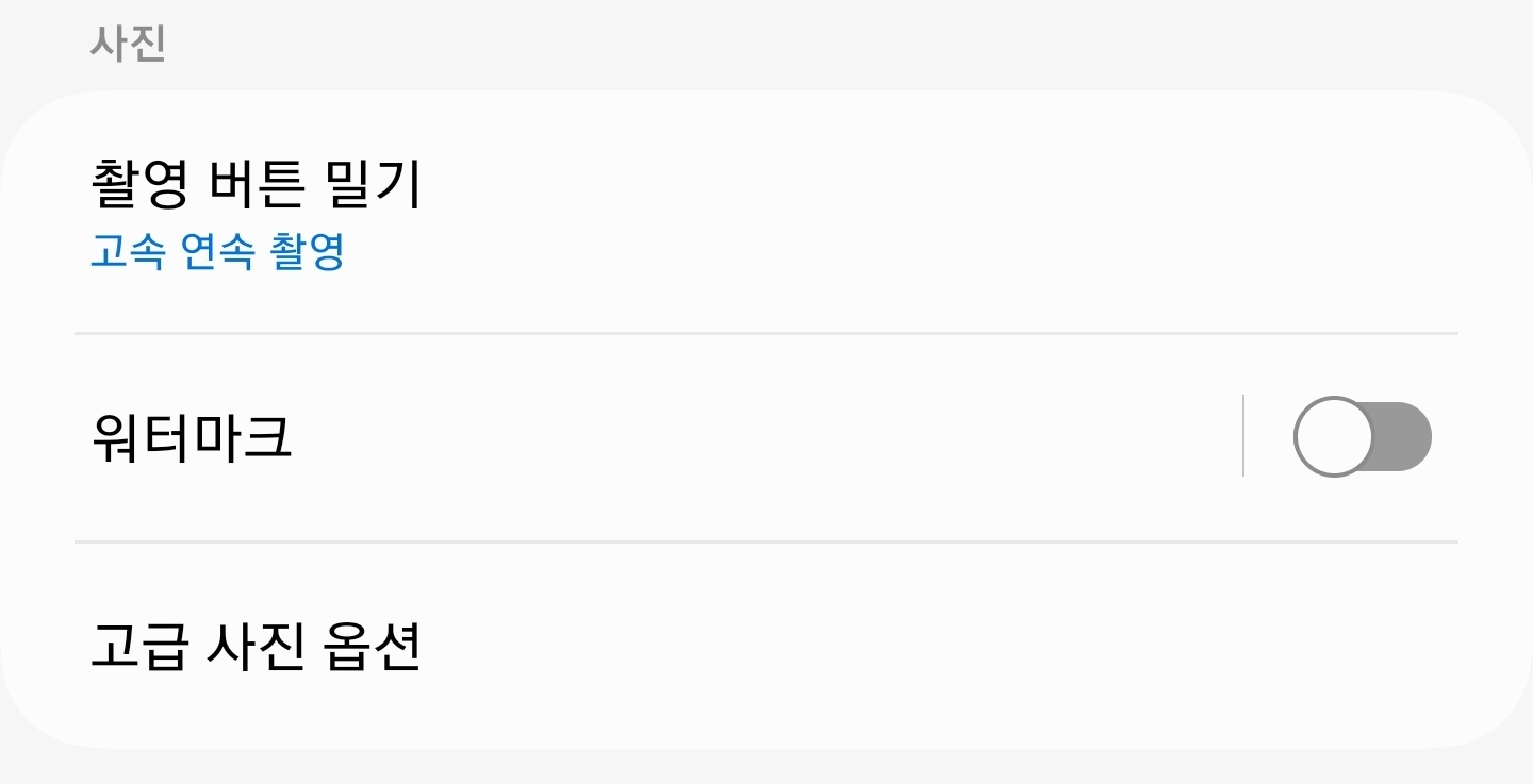 사진 설정에는 촬영 버튼 밀기, 워터마크, 고급 사진 옵션 설정이 있습니다. 촬영 버튼 밀기를 누르면 '사진 모드에서 촬영 버튼을 아래로 밀고 길게 눌렀을 때 어떤 작업을 할지 선택하세요.'라는 안내가 나옵니다. '고속 연속 촬영'과 GIF 만들기'를 선택할 수 있습니다. 원하는 기능을 선택하시면 됩니다. 워터마크는 활성화 시 사진을 찍으면 사진에 워터마크를 포함할 수 있습니다. 초기에는 스마트폰 기종 표시와 날짜 및 시간을 포함할 수 있습니다. 워터마크는 사용자가 '직접 추가한 정보'를 수정하여 나타내고자 하는 문자를 추가할 수 있습니다. 스타일에서 워터마크의 글꼴과 정렬로 위치를 지정할 수 있습니다.