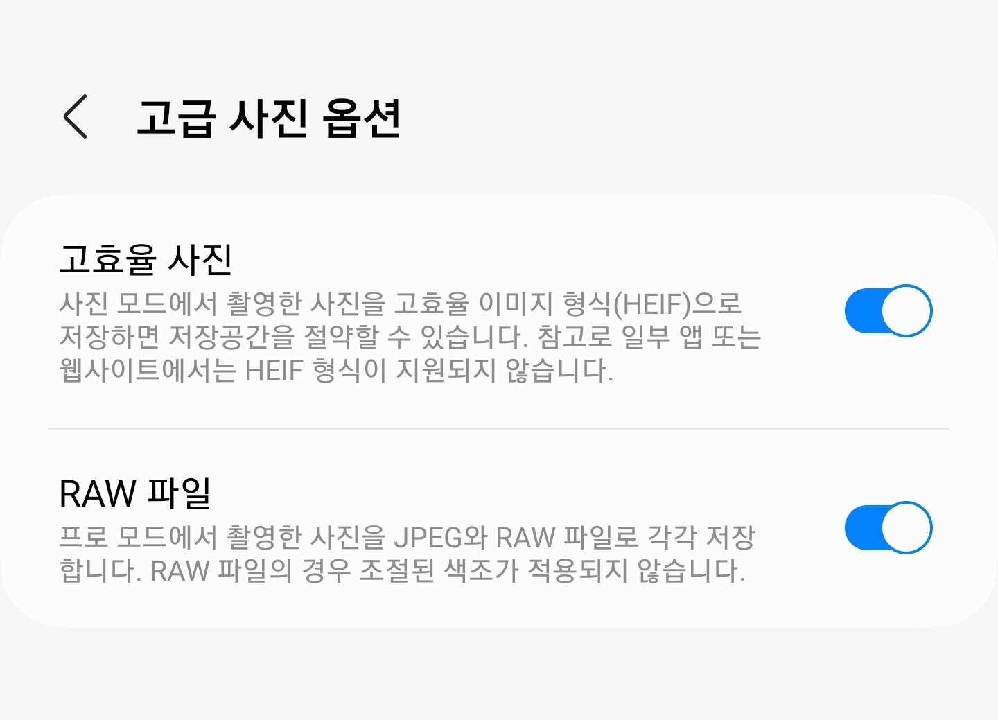 고급 사진 옵션을 누르면 고효율 사진과 RAW 파일 안내가 나옵니다. '고효율 사진'은 활성화 시 사진 모드에서 촬영한 사진을 고효율 이미지 형식(HEIF)으로 저장하면 자장공간을 절약할 수 있습니다. 참고로 일부 앱 또는 웹사이트에서는 HEIF 형식이 지원되지 않습니다. 'RAW 파일'은 프로모드에서 촬영한 사진을 JPEG와 RAW 파일로 각각 저장합니다. RAW 파일의 경우 조절된 색조가 적용되지 않습니다.